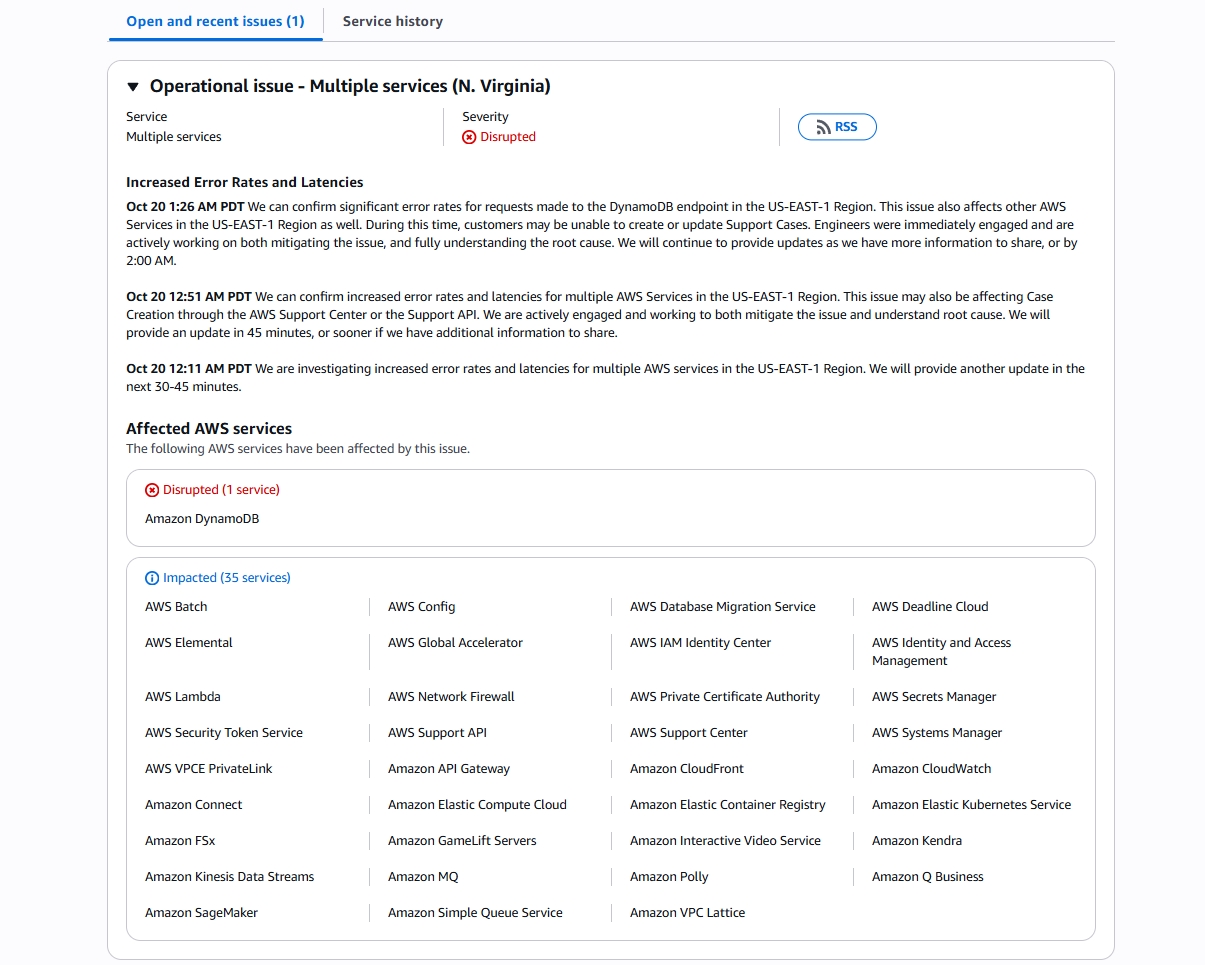 AWS’nin kontrol paneli, kesintiyi TSİ 10:11’de ilk olarak US-EAST-1 Bölgesi için rapor etti. Amazon, TSİ 10:51’de yayımladığı güncellemede, sorunu hem hafifletmek hem de kök nedenini anlamak için aktif olarak çalıştıklarını belirtti ve “45 dakika içinde veya paylaşacak ek bilgimiz olursa daha erken bir zamanda bir güncelleme yapacağız” dedi. Kesinti, hem bireysel kullanıcıları hem de AWS altyapısına bağlı kurumsal uygulamaları ciddi şekilde etkiledi.