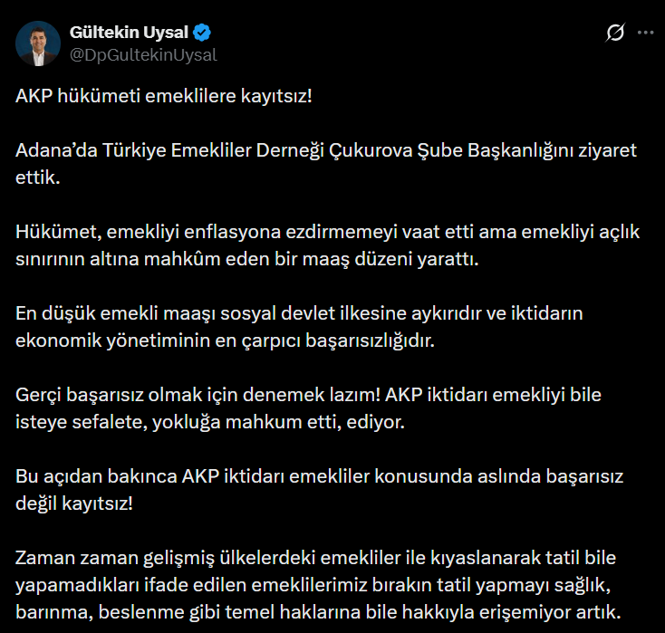 AKP iktidarının emeklilere kayıtsız kaldığını savunan Gültekin Uysal, ziyarete ilişkin sosyal medya hesabından şu açıklamayı yaptı: